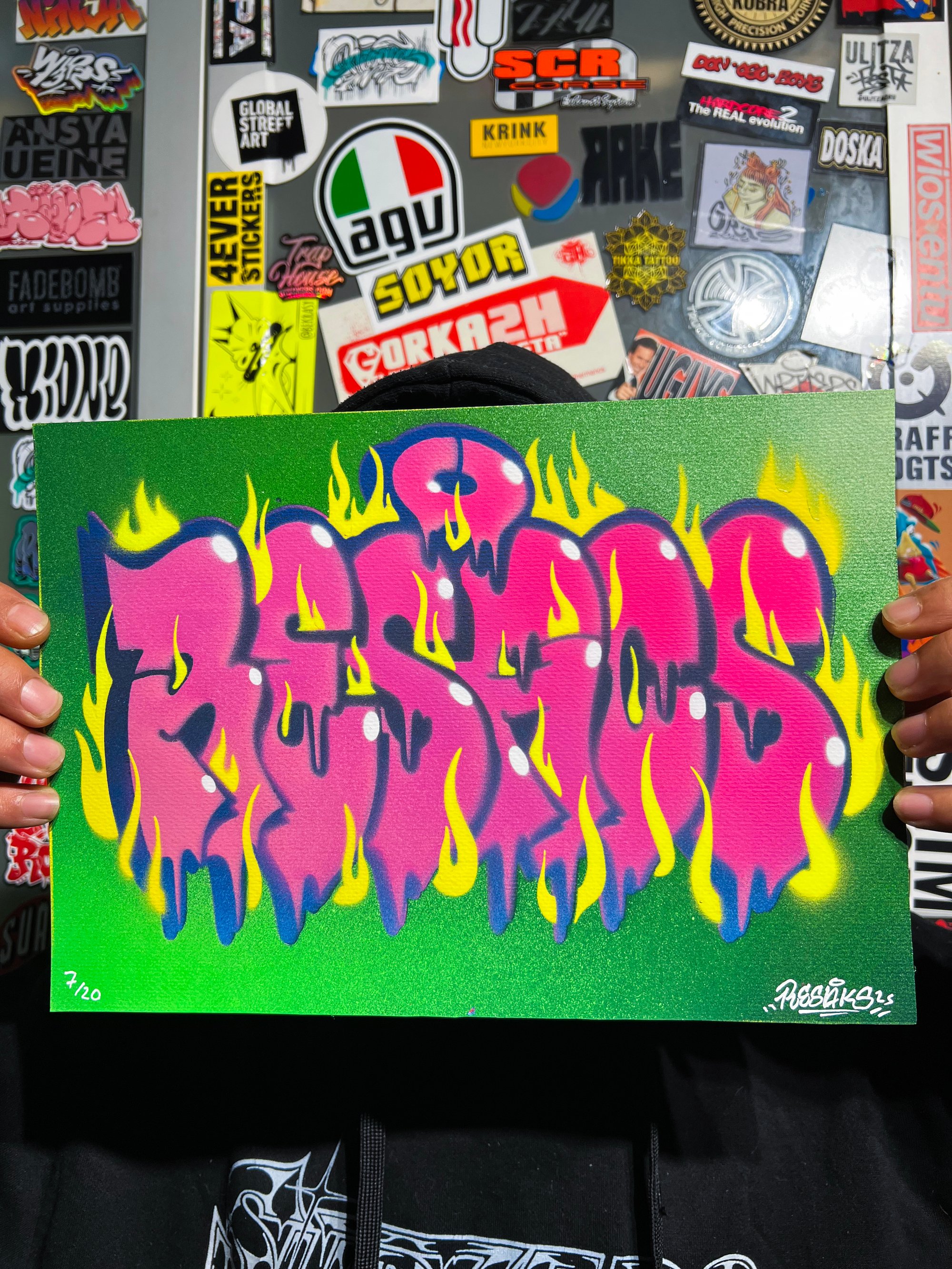 This piece is part of GraFFire UV, a limited series of 20 unique works, each one manually created using stencils made with laser cutting and direct spray application. Under natural light, the piece reveals a style inspired by classic graffiti; under blacklight (UV), the fluorescent paint reveals a second visual layer, invisible to the naked eye.