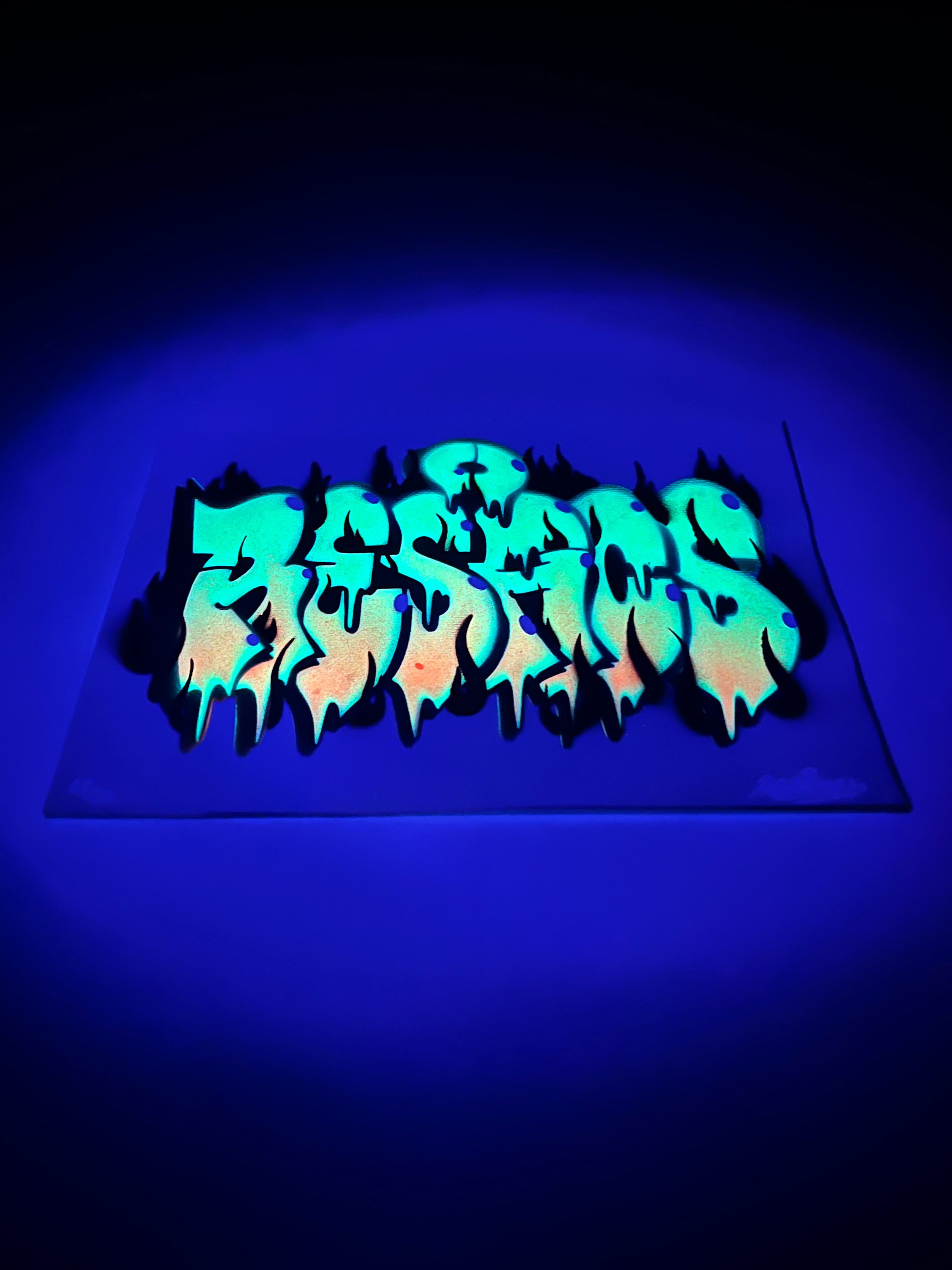 This piece is part of GraFFire UV, a limited series of 20 unique works, each one manually created using stencils made with laser cutting and direct spray application. Under natural light, the piece reveals a style inspired by classic graffiti; under blacklight (UV), the fluorescent paint reveals a second visual layer, invisible to the naked eye.