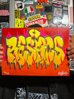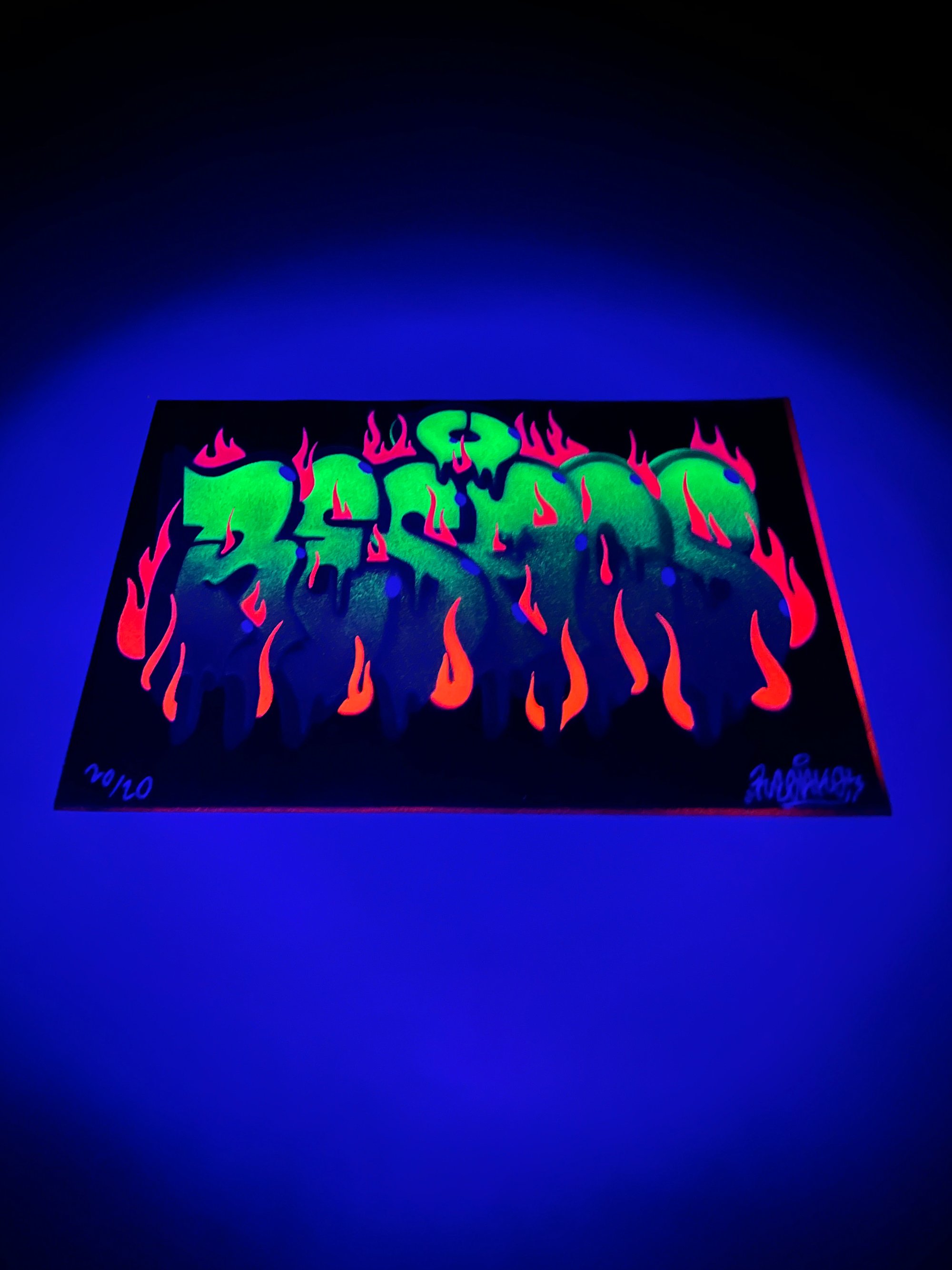 This piece is part of GraFFire UV, a limited series of 20 unique works, each one manually created using stencils made with laser cutting and direct spray application. Under natural light, the piece reveals a style inspired by classic graffiti; under blacklight (UV), the fluorescent paint reveals a second visual layer, invisible to the naked eye.