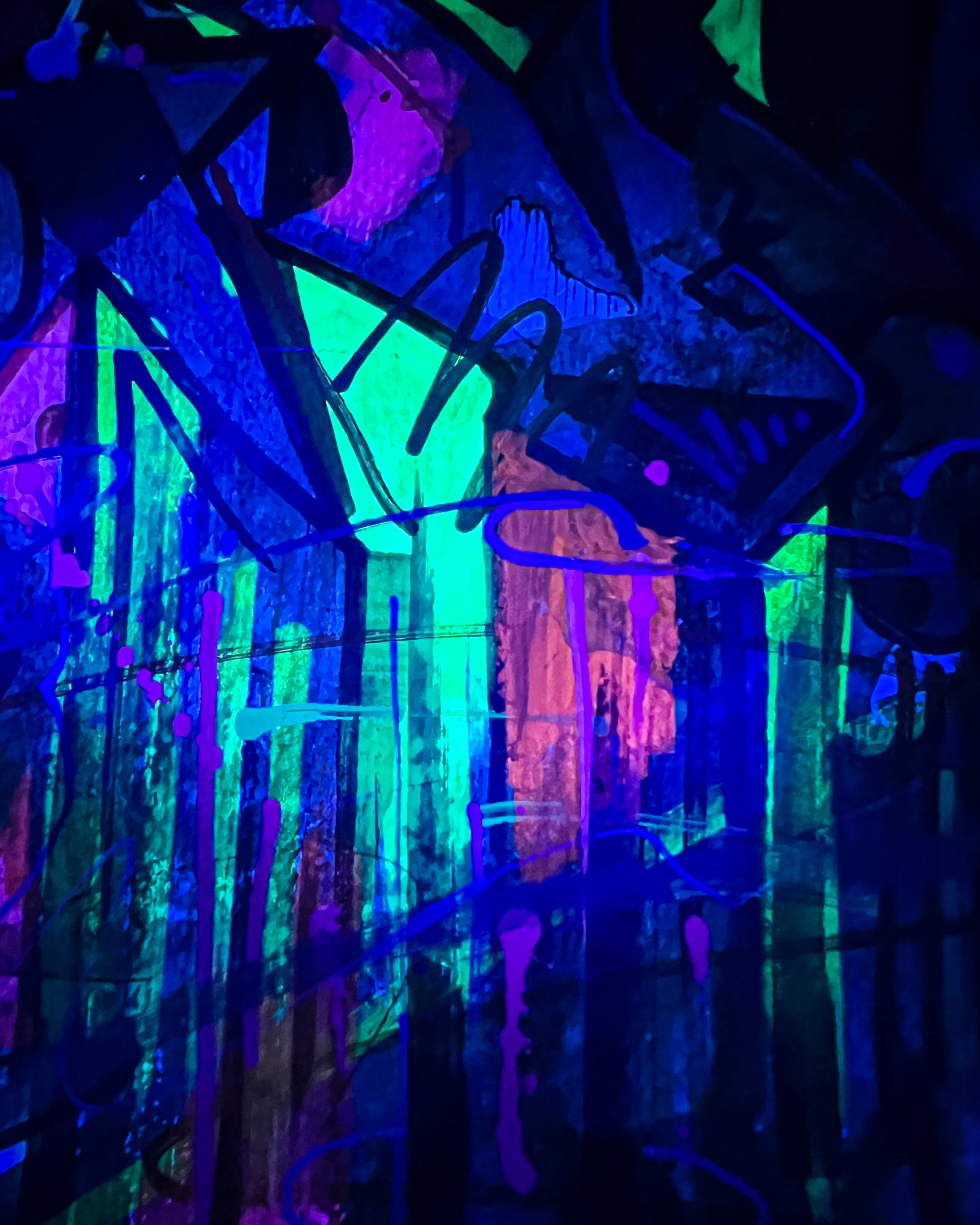 Each piece also reacts under UV light, revealing a luminous dimension that transforms the visual experience.